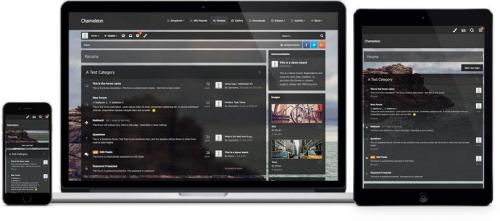 Chameleon Dark is an adaptive skin which uses semi-transparent "frosted glass" content boxes, allowing your background image to partially show through. This allows you to easily customize the genre of the theme by changing only the background image. The header collapses on-scroll, and stays at the top of the screen for easy access.
