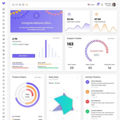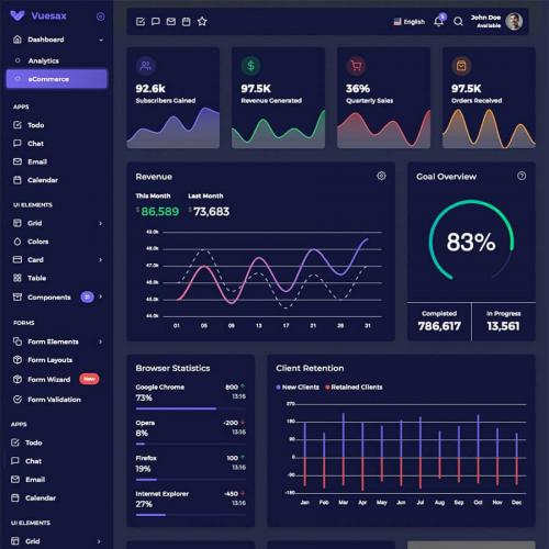 Vuesax provides unique features like fuzzy search, bookmarks, floating navbar, dark layout, advance cards and charts. It comes with 2 niche dashboards, 4 workable apps like email, chat, todo and calendar. Vuesax admin can be used for any type of web applications: Project Management, eCommerce backends, CRM, Analytics, Banking, Education, Fitness or any custom vuejs admin ashboard.
