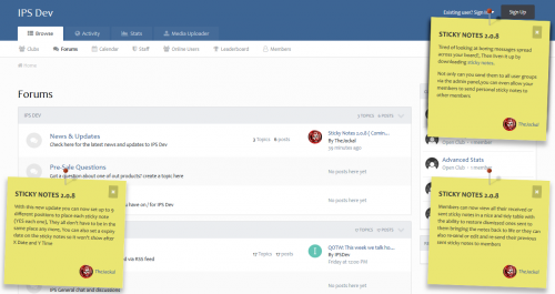 Tired of boring messages spread across your site? then liven it up by downloading Sticky Notes, this application will allow you, or if you have selected members, To post global Sticky Notes to other members on your board, Users can easily dismiss each Sticky Note and then can even drag and drop them around their screen