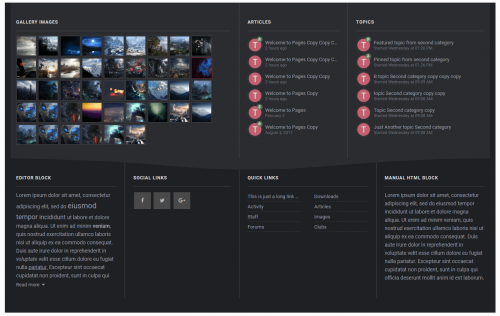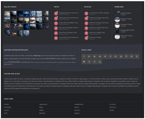 Advanced footer allows you to add a footer to your site with as many blocks as you want, including feeds from Forums, Gallery, Downloads, Pages, Facebook page feed, Twitter timeline feed, Adding members block, Custom Editor/HTML blocks and more.