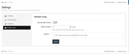 This plugin will let other users know that you are away for a specific reason. Made specifically for moderation purpose, can be used by any group to inform that you are away for a few days. Admins can remove the AWAY status from other users on Moderator CP -> Member Management -> Away tab.