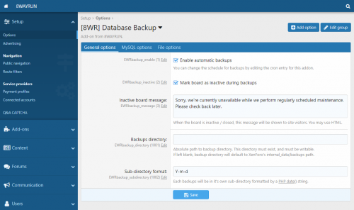 Back by popular demand, is my backup system. I wasn't planning on releasing this one, but a lot of people asked me for it, since there weren't any other solutions for XF2. This addon will run a scheduled backup of your XenForo database.