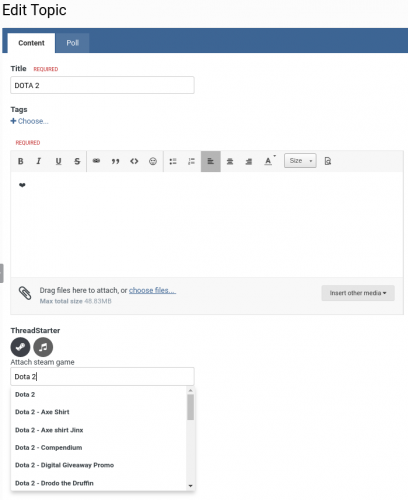 - Users can add steam games to topics. After attaching a game, which can be done easily using a search with auto complete, the thread will show various information about it above the post.
