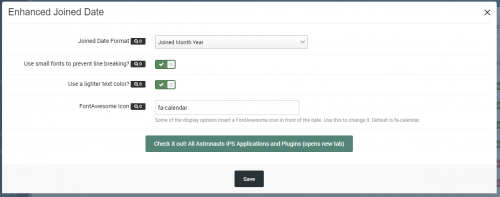 New with Version 3 is an additional format option of Joined Month Year, ability to customize the FontAwesome icon, and a toggle for the use of the class ipsType_light which controls whether the text is dark or a little lighter.