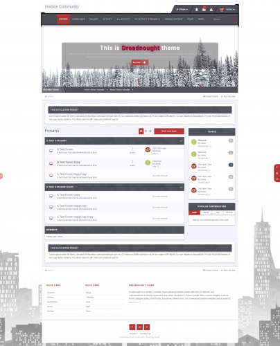 Dreadnought is modern, Creative, Super advanced theme comes with tons of customization's and features including responsive drop down navigation, Google fonts, custom html full-sized widgets, Advanced footer, Social links, News ticker, Custom forum category styles, Six of awesome article templates and a powerful touch slider that can be integrated with (IP.Content) as a complete package for infinite slider, theme colors are entirely customizable with easy settings, You can manually change ALL colors and switch between a Dark or White scheme with color settings. Dreadnought theme is beautifully responsive and mobile friendly, it is best suitable for Gaming website, Included with Dozen of useful settings and features for example adding a fixed social link on sidebar or footer, also two custom widgets to show on top or bottom of your website you can place it anywhere you want for example Registration page, Login page, Staff directory page, Search page, User profiles page...etc) You can also set user group permissions for each of the widgets