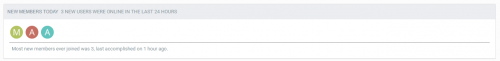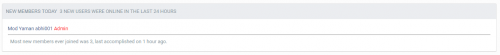 Keeps track of the number of new registered members that have visited your site in a custom duration and also records which day you set the record for the most new members online in the same day all options done via the front settings and Admin CP.