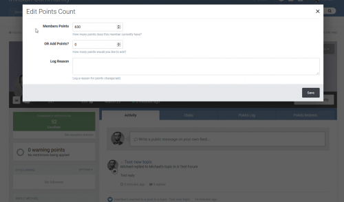 - Manually modify a members points count from their profile. Including a note stating the reason.