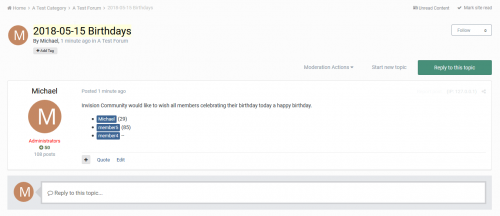 - Create new birthday topics or add replies to a "birthday topic" when there is a members birthday.