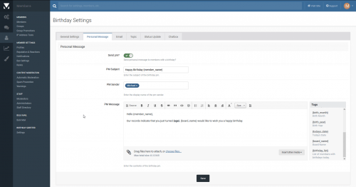 - Smart quick tags allow you to send out birthday greetings with information such as Board Name, Member's Name and Age. The following tags are included: {member_name}, {age}, {suffix}, {birth_day}, {birth_month}, {birth_year}, {todays_date}, {board_name} and {birthday_list}.