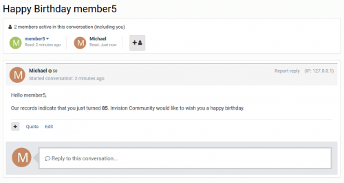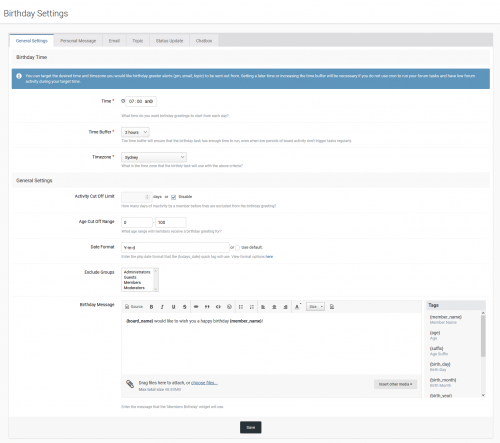 - Optional customizable birthday greetings via IPB personal message system.