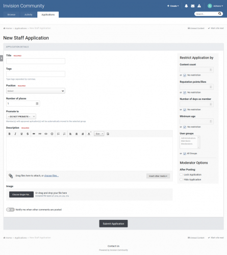 - Ability to restrict the application by: Content count, Reputation points/likes, Number of days as member, Minimum age and groups