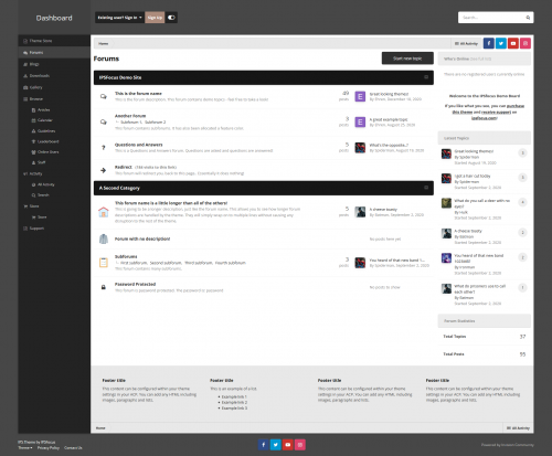 Dashboard is a feature-rich IPS theme and includes a nice blur effect behind the vertical navigation panel, a background changer and 'transparent' strips which allow the background image to alter specific internal areas of the theme.