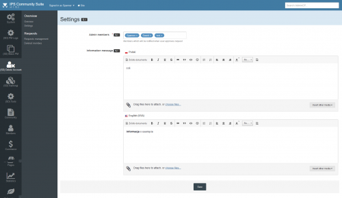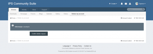 Application makes to easy proces removeing member account from board. Normally member must know to whom write message, but if someone hacked their account then he have problem after removeing accont. Now you do not need to know who and what to write. Only go to special page, accept form. Next board send email to your email address with additional confirmation. When you click confirmation link then administrator receive email with information that someone want to delete account and on special page on ACP he decide what he do.