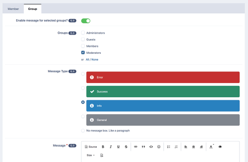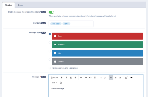 The application adds the ability to set an informational message when certain users or groups are selected as private message recipients.