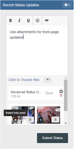 Display upload area? - Determines whether or not to display the upload area for Status Updates on the front page.