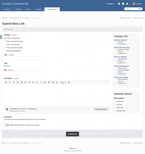 Links Directory is an application that provides your community with a member driven web directory. Allow members to submit websites for approval in categories you define. Users can comment and rate on other member’s submissions. You can also mark websites as official affiliates, fostering traffic between friends. Features Submit links to websites along with a title, description, and an image generated from extensible APIs available on internet, free and paid. You can also save the image locally, which will reduce the API call. Image is updated when you update the link. Admin can choose if new links are moderated, per category. Ability to charge per link, integrated to Commerce. Submit comments to links. Admin can choose if new comments are moderated, per category. Rate links using the star rating system used throughout the IPS4. Per category setting. Integrates to Share Links to share or email inks. Inregrates to Google Maps if and address is provided in the link submission (IPS 4.1.13+: Google Map APIs now requires an API key. Go to AdminCP -> System -> Community Enhancements to enable Google Maps support) Ability for users to report potentially offensive content or broken links using the built-in Report Center Search integration: search links along with the rest of your community’s content Supports item marking, allowing your users to see what links have been added or commented on Integrates into Activity Streams. Supports the built-in tagging system including prefixes. Support for notifications such as new links and comments on user links. Ability to follow/like categories and individual links. Unlimited categories of links, plus unlimited depth of parent-child relationships Category Icons Drag & drop reordering of categories in the ACP. Per-category permissions to show category, view links, submit links, add comments, and avoid approval queues Provide “link back” code so other websites can link back to yours. Mark links as official affiliates and display them in a different section on the Links Directory index Integrates into IPS4 Moderating system, which all commons permissions, such as pin, unpin, delete, feature, move, etc. Per-category Permissions allowing you to specify which permission sets are allowed to view category, view links, add links, edit links, comment, rate, and avoid moderation at a granular level. Robust Admin Restrictions. Integration with the Advertisements system Integration with Sitemap system to include links in your sitemap Ability to create RSS feeds of all links Integration with ACP Live Seach (Links categories) Support Extra Fields so you can define different fields per category Friendly URLs for links and categories Ability to configure the Links Index page to display the blocks you want And much, much more!1 point