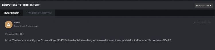 A few hours ago, we received a report demanding the removal of a particular file from our database. File in question: [Dark / Light] Fluent Design Theme Edition Here's a screenshot of that report. If you're interested in the link that you see in the screenshot, it just directs to a post in the support thread for the Fluent Design Theme on the Invision Marketplace. If you're thinking the author of the report seems familiar, you're not crazy! @aXen is the very same aXen | 1s2k, author of the Fluent Design Theme. After reaching out to aXen via private message, cordially informing him that we would not be removing the theme, aXen chose to threaten myself, and WebFlake, with litigation, ala "the courts" and "the law". To be clear, this thread isn't a retaliation for his threat per se because, frankly, we've had far more relevant individuals attempt to neutralize this community and to no avail. I'm posting this thread to highlight one of the prominent reasons WebFlake exists: people like aXen. Did you know that aXen has been a member of this community since October 12th, 2014? To date, aXen has downloaded 372 unique files from our database. That is 300+ files that aXen has benefited from but insists that "the law" is on his side regarding the removal of the Fluent Design Theme. He is perfectly content to be a part of the very same cycle that he is threatening litigation against — but only when it benefits him. I'm not at all interested in shakedowns, extortion, or idle threats from people like aXen. For any questions or concerns, you can reach aXen at [email protected]. You can also find his site listed as the demo for the aforementioned theme.17 points