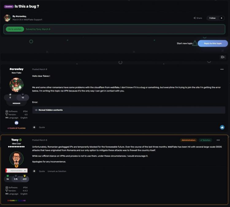 Hello WebFlakians, Due to an unforseen firewall issue and a policy inside of it that was set a little too strict, cloudflare has had some server nodes not being able to communicate with our server. This was particularly hard to fix due to myself and some other people still being able to access the website while users from different regions (who connect to different cloudflare nodes) could not connect to WebFlake. This has lead to a long time undetected issue resulting in way less activity and visitors from some countries. I'm pleased to announce that this bug is finally fixed and won't bother us anymore. Kind regards, WebFlake Team10 points