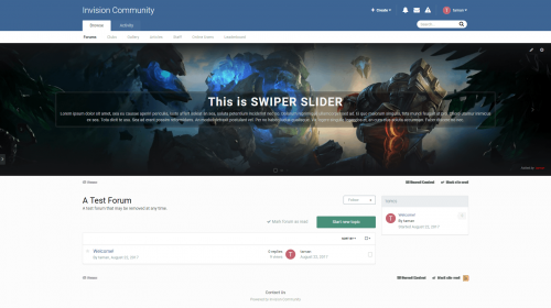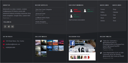 Theme Settings Easily enable, disable or modify theme features such as background images, logos, social media links, guest messages and colors. This makes modifications and upgrades very simple since little code changes are required. Minimal HTML edits This theme has only 3 modified template files, which means in most cases, you will not need to install theme updates between IPS versions. Too easy! Color Scheme Editor Your members can choose two colors to create their own color scheme from a predefined selection. This feature can be disabled easily if required. Background picker (if enabled) Your members can choose their own background image (or color) from a predefined selection and their choice is saved via cookies. This feature can be configured or disabled within the theme settings. Global message Display a message across the top of your site with important announcements. Once your members have seen the message, they can press the Dismiss button to remove it (until you configure a new one). Guest message A customizable message can be shown to guests, prompting them to either register or login to your forum. Social links Social links can be enabled/disabled and customized to your own URL, allowing you to easily link to your social network pages (facebook, twitter, etc) HTML logo with slogan Easily add/edit your text logo and slogan from within the theme settings. If required, the text can be replaced by an image instead. Mega Footer A mega footer with configurable column numbers and content can be enabled and customized all within the theme settings. -