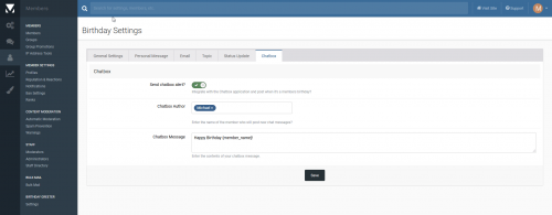 Birthday greeter that can send out birthday emails, topics, personal messages, status updates, give points and chatbox messages to members celebrating their birthday. Included widgets to also wish members a happy birthday. Click here to read my IPS Marketplace purchase guide before purchasing. Keep up to date with DevFuse mod development and releases. Features NEW Integration with Basic Points application to give out points on members birthday. Support for Chatbox birthday alert. Support for status update birthday alert. Select a preferred local time and timezone to send out birthday greetings. Exclude member groups such as Banned and Validating from receiving birthday greetings. Optional customizable birthday greetings via email. Optional widget that lists the members celebrating their birthday each day. Optional customizable birthday greetings via IPB personal message system. Choose to pin or close new birthday topics created. Option to include all birthday users each day in 1 topic, instead of 1 topic per members birthday. Create optional customizable birthday topics. Create new birthday topics or add replies to a "birthday topic" when there is a members birthday. Smart quick tags allow you to send out birthday greetings with information such as Board Name, Member's Name and Age. The following tags are included: {member_name}, {age}, {suffix}, {birth_day}, {birth_month}, {birth_year}, {todays_date}, {board_name} and {birthday_list}. -
