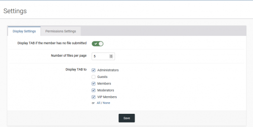 This resource will restore the FILES tab on user profile. Requirement: Downloads app Settings: Display TAB if the member has no file submitted Number of files per page Display Files TAB to chosen groups Display Files TAB from chosen groups Honor pinned files Hide Moderator options Important Notice: If you used the previous version of this resource (which was a plugin), follow the steps before install this application: Uninstall the plugin Via FTP, delete the following file from your file system: applications/downloads/extensions/core/Profile/Files.php. Install this application -