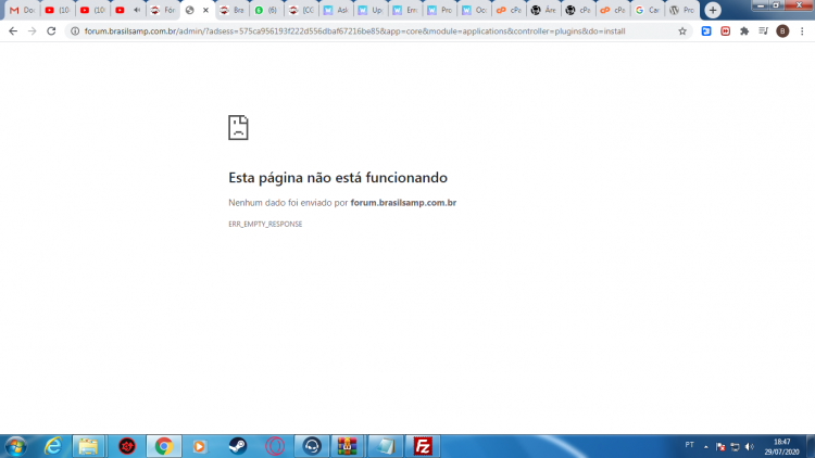 Good evening, I'm making a forum for some friends, and some applications the forum crashes, and it appears: '' This page is not working No data was sent by forum.brasilsamp.com.br '' Note: I'm Brazilian, forum version 4.4.10 (the last one, nulled from the webflake) php version: 7.3