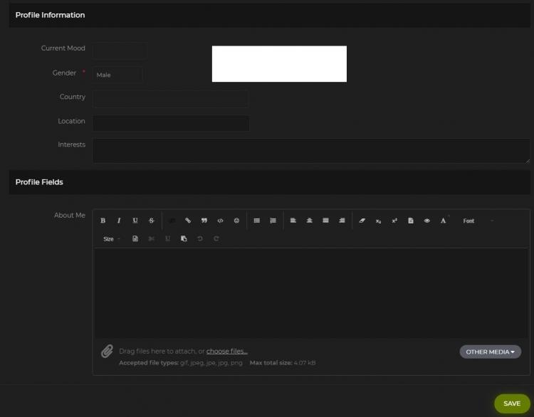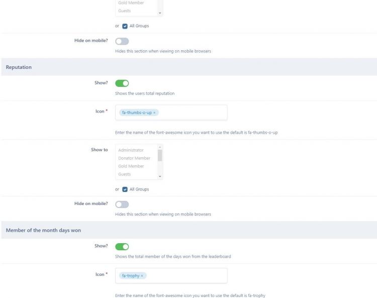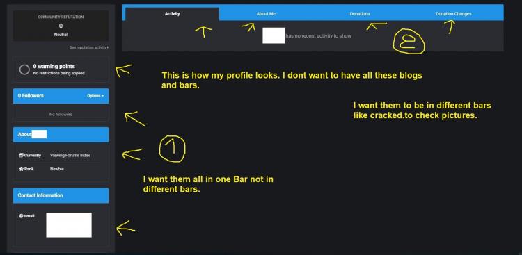 Hello everyone, I need some help to change some things on my Forum. Please any assistance, I would be greatful. 1. How can I remove the Send me news and updates button in the registration forum? 2. Where can I remove the copyright or branding text and add something else on the left or in the middle of the footer? 3. Where can I remove the text of the General Statistics Bar? 4. Where can I change the icons from the Menu Manager? 5. Where can I change the whole profile bars and blogs etc.? (See Pictures) I want it like this: 6. Where can I find these or different group icons? 7. Where can I find these or other group boxes? Thats all for now, thank you! @DicDal