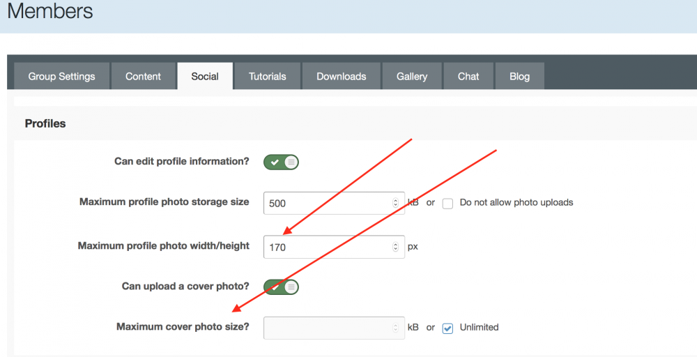 Scroll down to 'Uploading' section, find ' Personal Photo Limits' and adjust the profile picture dimensions and upload size. Save and repeat with other groups as required.