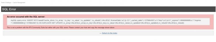 1. I have one forum that is still on version 3.4.8, the license has expired and I have not upgraded it yet because of the custom hooks that I have and they are not available on version 4.x The problem I have is that I can't do recache all, I get this error: mySQL query error: INSERT INTO baza87cache_store (`cs_array`,`cs_key`,`cs_value`,`cs_updated`,`cs_rebuild`) VALUES(1,'licenseData','a:2:{s:12:\"_cached_date\";i:1579864587;s:3:\"key\";a:2:{s:8:\"_expires\";i:9999999999;s:7:\"expires\";i:9999999999;}}',1579864587,0) ON DUPLICATE KEY UPDATE cs_array=VALUES(cs_array),cs_key=VALUES(cs_key),cs_value=VALUES(cs_value),cs_updated=VALUES(cs_updated),cs_rebuild=VALUES(cs_rebuild) I am not a sql expert but I guess the issue have something to do with a expired license. Do you have any clue how to fix this, or I need to renew license and ask invision for a help? I will appreciate any help, thx.