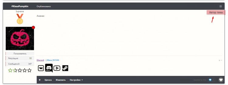 Maybe someone will be useful this option without the plugin. Go to templates > forums > front > topics > post find <div class='cPost_contentWrap ipsPad'> after adding {{if $comment->author()->member_id and $item->author()->member_id == $comment->author()->member_id}} <div style="margin-top:-8px; margin-right:0px; position:absolute;z-index:100;" class="SVG ipsResponsive_hidePhone"> <div class="ipsResponsive_hidePhone">Автор темы</div></div>{{endif}} in custom.css .SVG { position: absolute; font-size: 15px; z-index: 5; height: 25px; font-weight: 400; font-family: "Bebas Neue", sans-serif; text-align: center; line-height: 25px; right: -6px; top: 10px; color: #3e4148; border-top-right-radius: 3px; border-top-left-radius: 3px; border-bottom-left-radius: 3px; background-color: #d4202763; text-shadow: 0px 0.03em 0px rgba(0, 0, 0, 0.1), 0px 0.15em 0.11em rgba(0, 0, 0, 0.1), 0px 0.25em 0.02em rgba(0, 0, 0, 0.05), 0px 0.32em 0.32em rgba(0, 0, 0, 0.05); box-shadow: 0px 0.03em 0px rgba(0, 0, 0, 0.2), 0px 0.15em 0.11em rgba(0, 0, 0, 0.04), 0px 0.25em 0.02em rgba(0, 0, 0, 0.04), 0px 0.32em 0.32em rgba(0, 0, 0, 0.04); width: 10%; -webkit-backface-visibility: hidden; -moz-backface-visibility: hidden; backface-visibility: hidden; } .SVG:before { clear: both; display: block; } .SVG:after { content: ''; position: absolute; border-right: 6px solid transparent; border-bottom: 0; border-top: 8px solid #d4202763; border-left: 0t; right: 0; bottom: -8px; z-index: 1; }