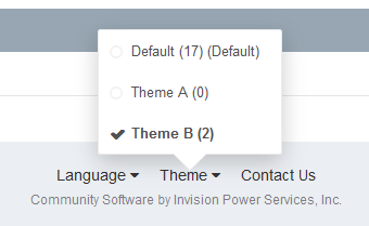 Don't be a leech, click the reputation button if you want to get more files in the future. This plugin will show how many users are using each theme. Notes: It uses cache (data store file): no additional query on every page load to get the number of users A task runs at every 6 hours to update the counter with new and deleted members- 1 review