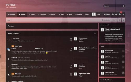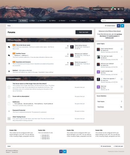 Dimension by ipsfocus Dimension is a minimalistic theme for IPS.Suite with a unique header effect. Once scrolled, the header collapses into a fixed bar at the top of the page, providing easy access to your navigation links. Theme features Theme Settings Easily enable, disable, or modify theme features such as background images, logos, social media links, guest messages, and colors. This makes modifications and upgrades very simple since little code changes are required. Fixed header on-scroll Once scrolled, your header collapses and sticks to the top of the page. The background image becomes blurred (in compatible browsers), placing focus on your navigation links. "Inherited" background images Title bars inherit the same background image as your header, maintaining a consistent color scheme throughout your suite. Header Picker Your members can choose their own background image (or color) from a predefined selection and their choice is saved via cookies. This feature can be configured or disabled within the theme settings. Guest Message The "Guest message" widget is restyled to grab your visitor's attention. It can be added to any widget location: header, footer, or sidebar. Social links Social links can be enabled/disabled and customized to your own URL, allowing you to easily link to your social network pages (Facebook, Twitter, etc) HTML logo with slogan Easily add/edit your text logo and slogan from within the theme settings. If required, the text can be replaced by an image instead. Mega Footer A mega footer with configurable column numbers and content can be enabled and customized all within the theme settings. Minimal HTML edits This theme has very few template files, which means in most cases, you will not need to install theme updates between IPS versions. Too easy! Latest Topic on Mobiles The latest topic title is visible on tablets and mobiles, allowing more convenient access to your latest content for mobile users. Global Message Display a message across the top of your site with important announcements. Once your members have seen the message, they can press the Dismiss button to remove it (until you configure a new one). Retina Ready All gradients, shadows, and icons are generated using CSS which means your site will look great on all devices - even those with high-resolution screens. Demo: Available on ipsfocus More information and full feature list -
