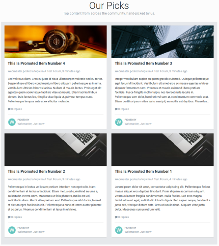 This is a small plugin to enhance some features of the core Our Picks page. I have always felt that the default Our Pick's Page was a little disorganized and all over the place. This little plugin will change the default look to look a bit more appealing and organized. There are 4 settings to help with this: Header default Image: Select a default image for promoted items that do have an image. Header Background color: Change the background color if you do not want to display a background image. Display Extra info: Enable or disable showing the 'Picked By' author and date, Cover Picks Columns: Select the number of columns per row for each item. This will not work with Fosters Our Pick Improvements, as they're not compatible with each other due to both modifying the same code. -