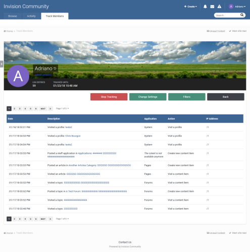 Do you need to track the activities of specific members on your forum? Track Members will allow you to track the steps of any member as they interface with your forum and it is highly configurable to include settings for the time frame and a multitude of trackable actions (Account Actions, Profile Actions, Messenger Actions, Content Actions). It also provides settings for automatic member tracking for members being warned as well as new members. - PERMISSIONS TO USE There are two Moderator permissions to use the application: Can track members? Can view logs from tracked members? - TRACK ACTIONS: Account Actions Sign In, Sign Out, Change password, Change email address, Update personal photo, and Upload a cover photo Profile Actions Visit a profile, Follow/Unfollow a member, Ignore/Stop ignoring a member, Post a status update, and Reply to a status update Messenger Actions Enable/Disable Messenger, Start a new conversation, Reply to a conversation, and Left a conversation Content Actions Visit a content item, Create a new content item, Reply/comment on a content item, Review a content item, Respond to a review on a content item, React/Unreact to content items, replies/comments and reviews, and Follow/Unfollow content items/categories Clubs Create a club, Edit club settings, Feature/Unfeature a club, Invite members to a club and Request to join/join/leave a club. Search Use the search system. You will be able to know what your members are searching/looking for and thus make decisions regarding your content. You can choose which setting will be enabled by default in Settings. Disabled settings will not appear to the moderator in the track popup. - LOGS Logs will be available on: Admin CP module App Index A tab in a user profile Only moderators with proper permission will be able to view the logs - TRACK/STOP TRACKING You can can track/stop tracking members from: app index member profile member mini profile (hover link) - COMPATIBILITY Member History: it will be logged the moderator who started and stopped tracking the member Moderator Log: it will be logged the member who is being tracked and also when stopped being tracking - TOOLS Track all members from a specific group for a defined number of days Stop Tracking All Members Prune Logs Prune Orphaned Logs (logs from members currently not being tracked) - SETTINGS Several settings, such as: Groups to be tracked Flood time control Number of log entries on the App index and in the ACP module Trackable actions Integration to Warn System: you can track a warned member for a specific number of days New Members: you can track new members for a specific number of days Prune tracking logs management More... -