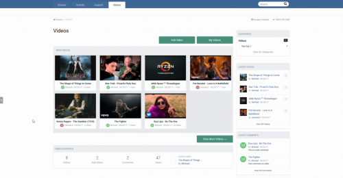Allows your participants to send their own videos for viewing in the community. Support is included for all major video sites. Characteristics: NEW Support for user fields for each category. NEW Support for fast video addition. NEW Video.JS support for downloaded videos. NEW Improved interface design, new trends, tracking, detection, and adding tabs. Includes numbering of pages and sorting. NEW Support for importing RSS for video. -