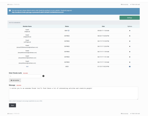 With this app, you can allow your members to invite other members. Features: enable/disable system, select allowed groups to use this mod, three invite types: free -> user may or may not enter inviter name; force -> user must enter inviter name; invite-only: user must be referred by invite form (with hashed keycode), list of all invited users, list of all invited users in ACP with filter options, invites by referral link, points system integration (any system!), promotion to the new group after reaching a specific amount of referred users, ability to enable/disable member powers to raise people via ACP, info in member profiles about referrers, ability to add/edit/remove referred transactions, ability to turn off the "Referrer Information" block in profiles, ability to award a referrer if his referred member made a topic/post, invite form, option to enable/disable custom invite messages, option to disable invites from the same IP and much more, resend option to resend sent invites, option to approve transactions only if the referrer adds more than X defined posts. -