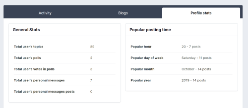 The application collects basic statistics of user activity and displays them in the tables and charts in a separate tab in the profile. You can control which user groups will be able to view the tab with such statistics. Capabilities Block with basic statistics - the number of topics, posts, polls, etc. Block with information displaying the most active time periods - hour, day of the week, month, year. User activity chart by hours, days of the week, months, and years. User activity on specific forums, percentage of activity. A section in each forum that collects all posts by a particular user in chronological order. Now it's for free. -