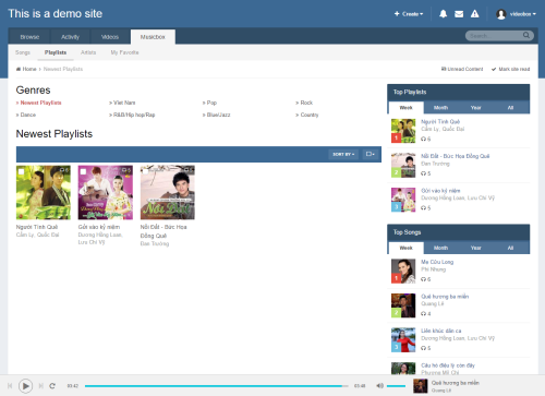 MusicBox is an application for IPS 4.x that allows users to upload their music online and share it on social networks. Features: Upload your music. Create playlists. Genres (categories) for songs, and playlists. Custom Fields: create any number of custom fields that can be required (or optional) when users upload songs. Integrated with Nexus so users can sell/buy songs. Profile page for an artist with a rating system. Favorite system: users can create custom playlists. The music player supports random, repeat mode. Play music when embedding the link in other apps (Forums, Pages, Blogs,...). Import songs from the RSS feed. Comment system. Rating system. Sharing system. Tags. Friendly URL. -