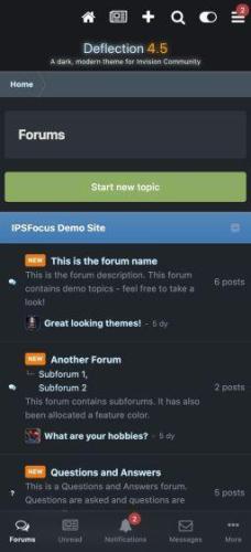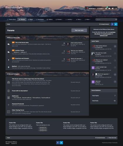 Dimension Dark by ipsfocus Dimension Dark (also available in a light version) is a theme for IPS.Suite which recycles your background image throughout the theme. The header collapses into a fixed bar at the top of the page once it has been scrolled, providing easy access to your navigation links. DEMO Theme Features Theme Settings Easily enable, disable, or modify theme features such as background images, logos, social media links, and colors. This makes modifications and upgrades very simple since little code changes are required. Fixed header on-scroll Once scrolled, your header collapses and sticks to the top of the page. The background image becomes blurred (in compatible browsers), placing focus on your navigation links. 'Inherited' background images Title bars inherit the same background image as your header, maintaining a consistent color scheme throughout your suite. The Customizer The Customizer allows your members to customize certain elements of your theme based on their own preferences. Background picker If enabled, your members can choose their own background image or color from a predefined selection. Their choice is saved via cookies and automatically loads each page visit. A "Random" option will randomize the background on each page load. Mobile Footer A sticky footer at the bottom of mobiles provides easy access to commonly used areas throughout your site. HTML logo with slogan Easily add/edit your text logo and slogan from within the theme settings. If required, the text can be replaced by an image instead. Guest Message A customizable message can be shown to guests, prompting them to either register or login to your forum. Two designs, "billboard" and "alert" (shown) are available. Latest Topic on Mobiles The latest topic title is visible on tablets and mobiles, allowing more convenient access to your latest content for mobile users. Social links Social links can be enabled/disabled and customized to your own URL, allowing you to easily link to your social network pages (Facebook, Twitter, etc) Mega Footer A mega footer with configurable column numbers and content can be enabled and customized all within the theme settings. Retina Ready All gradients, shadows, and icons are generated using CSS which means your site will look great on all devices - even those with high-resolution screens. -