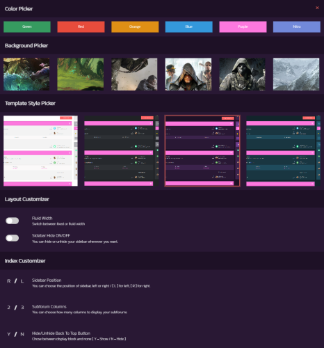 Nitro is a template based mainly on gaming but with many options to change the look. It has the dark and light version but also with a lot of options to change the colors, wallpapers, etc. Theme Features [ ACP ] : Background Picker Index Settings Mega Footer is fully customizable The Sidebar Slider is fully customizable Social Links customizable Auto Typing Special Forums [ for promoted servers or whatever you want to do with this feature ], fully customizable Style Picker Customizer : Color Picker [ 6 colors ] Background Picker [ 6 backgrounds ] 4 different theme variations [ light/dark (s1)/dark (s2)/dark (s3)/dark (s4) ] Fluid width Switch [ Switch between Fixed and Fluid ] Show / Hide Sidebar Sidebar position [ Left / Right ] Chose sublist columns [ 2 / 3 ] Show / Hide Back To Top Button New : Redesigned header menu [ now works with menu manager ] Clean CSS code [ with vars ] Redesigned Header Redesigned Post Container Redesigned Footer And Much More Warnings : This new version is available just from 4.6 [ Working with 4.6 & 4.7 ] No Renewal anymore you are free to use this theme for life Plugins Used : General Statistics [ write me and I will send you the plugin ] Chatbox Free -