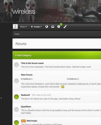 Wireless: A gaming theme for IPS // ipsfocus Wireless is a gaming theme, perfect for clan communities or game related sites. It features a rotating header when the page is scrolled, which is customizable using the background picker. The green colour scheme can be modified easily within the theme settings. Theme Features Theme Settings Easily enable, disable or modify theme features such as background images, logos, social media links, guest messages and colors. This makes modifications and upgrades very simple since little code changes are required. Rotating header The header rotates once the page is scrolled - compatible in most modern browsers. This feature can easily be disabled within the theme settings if necessary. Change color scheme The green color is controlled via the theme settings. Changing the color scheme only takes a few clicks! Background picker If enabled, your members can choose their own background image or color from a predefined selection. Their choice is saved via cookies and automatically load each page visit. Guest message A customizable message can be shown to guests, prompting them to either register or login to your forum. Two designs, "billboard" and "alert" (shown) are available. Global message Display a message across the top of your site with important announcements. Once your members have seen the message, they can press the Dismiss button to remove it (until you configure a new one). Social links Social links can be enabled/disabled and customized to your own URL, allowing you to easily link to your social network pages (facebook, twitter, etc) HTML logo with slogan Easily add/edit your text logo and slogan from within the theme settings. If required, the text can be replaced by an image instead. Mega Footer A mega footer with configurable column numbers and content can be enabled and customized all within the theme settings. Optional fixed header If enabled via theme settings, your header will stick to the top of the page, allowing for easy access to your navigation. For a full feature list including a live demo, take a look at Wireless on ipsfocus! -