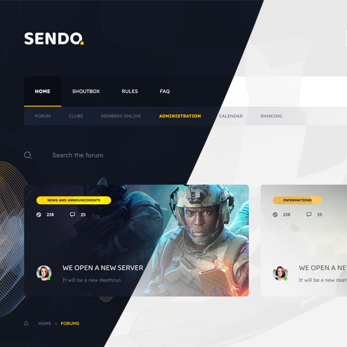 Sendo Theme ( IPS version 4.7 ) Template with a choice of ( White/Dark ) color versions. Colors and sizes using CSS Vars. When choosing the font color, the theme has many settings and can be fully customized. It's perfect for all forums, beautifully displaying all site content. Possibility to change header, slider, navigation, popups, forms, comments, and much more.. Permanent support - Write me a private message and you will receive the rank of the customer on the ips.themeo.co You can buy (50$) a plug-in to remove the copyright from the footer. ( private message ) (click) View demo (click) Login: demo Password: demo Theme by themeo.co -
