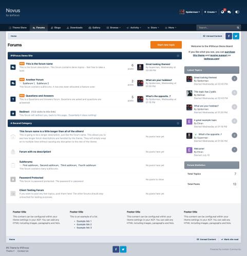 Novus by ipsfocus Novus is a clean, modern theme with a professional colour scheme, dropdown menus and sticky navigation. The optional background picker allows your visitors to customize the theme to their own preference too! This theme is built on a modern framework with minimal HTML modifications, which means it'll upgrade easily (and usually automatically) between IPS versions. Theme features Theme Settings Easily enable, disable or modify theme features such as background images, logos, social media links, guest messages and colors. This makes modifications and upgrades very simple since no code changes are required. Minimal HTML edits This theme has only 3 modified template files, which means in most cases, you will not need to install theme updates between IPS versions. Too easy! Sticky Navigation The navigation bar sticks to the top of the screen, allowing for easy access to your popular links at all times. Available in modern browsers only. Dropdown Navigation Menus All sub navigation links are placed inside a dropdown menu which is visible on-hover. Background Picker (optional) If enabled, your members can choose their own header background image from a predefined selection and their choice is saved via cookies. This feature can be customized within the theme settings. Mega Footer (optional) A mega footer with configurable column numbers and content can be enabled and customized all within the theme settings. Social links Social links from over 20 sites can be customized via the theme settings, allowing you to easily link to your social network pages (facebook, twitter, etc) Global message Display a message across the top of your site with important announcements. Once your members have seen the message, they can press the Dismiss button to remove it (until you configure a new one). Guest message A customizable message can be shown to guests, prompting them to either register or login to your forum. Two designs, "billboard" and "alert" (shown) are available. HTML logo with slogan Easily add/edit your text logo and slogan from within the theme settings. If required, the text can be replaced by an image instead. Latest Topic on Mobiles The latest topic title is visible on tablets and mobiles, allowing more convenient access to your latest content for mobile users. Retina Ready All gradients, shadows and icons are generated using css which means your site will look great on all devices - even those with high resolution screens. -