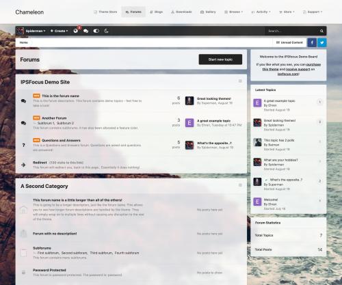 Chameleon by ipsfocus Chameleon is an adaptive skin which uses semi-transparent "frosted glass" content boxes, allowing your background image to partially show through. This allows you to easily customize the genre of the theme by changing only the background image. The header collapses on-scroll, and stays at the top of the screen for easy access. Themes features Theme Settings Easily enable, disable or modify theme features such as background images, logos, social media links, guest messages and colors. This makes modifications and upgrades very simple since little code changes are required. Sticky, shrinking header The header shrinks in size and sticks to the top of the page for easy access to user controls and the board index. Frosted Glass content boxes Your background image is displayed beneath your content boxes which have a frosted glass effect (available in all modern browsers except IE and Edge). Background picker If enabled, your members can choose their own background image from a predefined selection and their choice is saved via cookies. Guest message A customizable message can be shown to guests, prompting them to either register or login to your forum. Two designs, "billboard" and "alert" (shown) are available. Social links Over 20 social links can be enabled/disabled and customized to your own URL, allowing you to easily link to your social network pages (facebook, twitter, etc). If your site doesn't exist, it's easy to add custom icons to the list! HTML logo with slogan Easily add/edit your text logo and slogan from within the theme settings. If required, the text can be replaced by an image instead. Mega Footer A mega footer with configurable column numbers and content can be enabled and customized all within the theme settings. High quality on every screen! By using scalable fonts and CSS effects to create the theme, it'll look great on any screen - even ones with high resolutions! -
