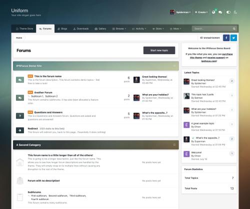 Uniform by ipsfocus Uniform is a responsive, light, modern theme focused around a background picker which applies a single background image throughout the entire forum, including category bars and forum icons. The theme is packed with customizable features which can be easily enabled or disabled from within the Admin Control Panel, including a background picker, guest message, social links and mega footer! The theme comes with 4 background images which can be edited easily in your ACP. It's a perfect, simple and easy method for customizing this theme so it matches the genre of your site! Theme Features Theme Settings Easily enable, disable or modify theme features such as background images, logos, social media links, guest messages and colors. This makes modifications and upgrades very simple since little code changes are required. Background picker Your members can choose their own background image (or color) from a predefined selection and their choice is saved via cookies. This feature can be configured or disabled within the theme settings. Guest message The "Guest message" widget is restyled to grab your visitors attention. It can be added to any widget location: header, footer or sidebar. Social links Social links can be enabled/disabled and customized to your own URL, allowing you to easily link to your social network pages (facebook, twitter, etc) HTML logo with slogan Easily add/edit your text logo and slogan from within the theme settings. If required, the text can be replaced by an image instead. Mega Footer A mega footer with configurable column numbers and content can be enabled and customized all within the theme settings. Minimal HTML edits This theme has very few template files, which means in most cases, you will not need to install theme updates between IPS versions. Too easy! Latest Topic on Mobiles The latest topic title is visible on tablets and mobiles, allowing more convenient access to your latest content for mobile users. Global Message Display a message across the top of your site with important announcements. Once your members have seen the message, they can press the Dismiss button to remove it (until you configure a new one). Retina Ready All gradients, shadows and icons are generated using css which means your site will look great on all devices - even those with high resolution screens. Demo // Detailed list of features -
