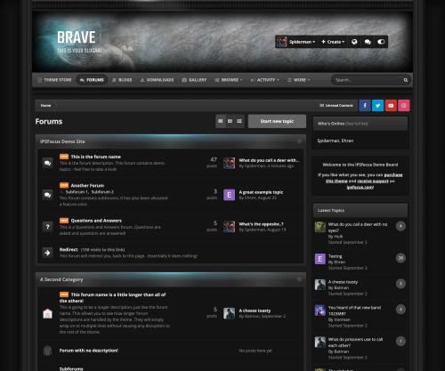 Brave by ipsfocus Brave is a dark IPS theme perfect for gaming sites or clan communities. Your members can customize the header themselves by choosing their own image from a preset array! Theme Features Theme Settings Easily enable, disable or modify theme features such as background images, logos, social media links, guest messages and colors. This makes modifications and upgrades very simple since little code changes are required. Easily edit color scheme Changing the default color scheme to your own color is very simple via the theme settings! With a few clicks, you'll have an entirely unique color scheme for your site! Social links Social links can be enabled/disabled and customized to your own URL, allowing you to easily link to your social network pages (facebook, twitter, etc) Background picker Your members can choose their own background image (or color) from a predefined selection and their choice is saved via cookies. This feature can be configured and disabled if necessary within the theme settings. Background settings Restrict the background picker to certain groups such as registered members or VIP's. Or remove the picker entirely from mobiles to save bandwidth on the go. All within the settings! Global message Display a message across the top of your site with important announcements. Once your members have seen the message, they can press the Dismiss button to remove it (until you configure a new one). Guest message A customizable message can be shown to guests, prompting them to either register or login to your forum. Two designs, "billboard" and "alert" (shown) are available. HTML logo with slogan Easily add/edit your text logo and slogan from within the theme settings. If required, the text can be replaced by an image instead. Mega Footer A mega footer with configurable column numbers and content can be enabled and customized all within the theme settings. For a full list of features and a live demo, visit Brave on ipsfocus -