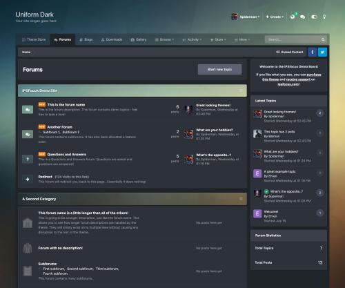 Uniform Dark Uniform is a dark, modern theme focused around a background picker which applies a single background image throughout the entire forum, including category bars and forum icons. The theme is packed with customizable features which can be easily enabled or disabled from within the Admin Control Panel. Theme Features Theme Settings Easily enable, disable or modify theme features such as background images, logos, social media links and colors. This makes modifications and upgrades very simple since little code changes are required. Background picker If enabled, your members can choose their own background image or color from a predefined selection. Their choice is saved via cookies and automatically load each page visit. HTML logo with slogan Easily add/edit your text logo and slogan from within the theme settings. If required, the text can be replaced by an image instead. Guest message A customizable message can be shown to guests, prompting them to either register or login to your forum. Two designs, "billboard" and "alert" (shown) are available. Latest Topic on Mobiles The latest topic title is visible on tablets and mobiles, allowing more convenient access to your latest content for mobile users. Social links Social links can be enabled/disabled and customized to your own URL, allowing you to easily link to your social network pages (facebook, twitter, etc) Mega Footer A mega footer with configurable column numbers and content can be enabled and customized all within the theme settings. Retina Ready All gradients, shadows and icons are generated using css which means your site will look great on all devices - even those with high resolution screens. Demo // Detailed list of features -