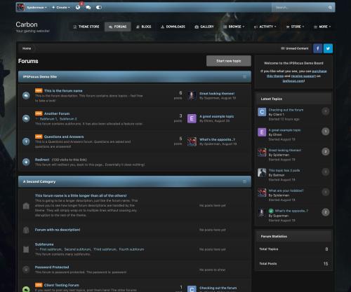 Carbon for IPS.Suite 4.x! Carbon, named after the carbon texture which is used throughout the design, is a dark theme for IPS.Suite 4.x and is especially perfect for gaming sites. The blue color scheme can be modified easily with a few simple clicks in your ACP theme settings, and your members can customize the theme themselves by choosing their own background image from a preset array! Theme features Theme Settings Easily enable, disable or modify theme features such as background images, logos, social media links, guest messages and colors. This makes modifications and upgrades very simple since little code changes are required. Easily edit color scheme Changing the default color scheme to your own color is very simple via the theme settings! With a few clicks, you'll have an entirely unique color scheme for your site! Social links Social links can be enabled/disabled and customized to your own URL, allowing you to easily link to your social network pages (facebook, twitter, etc) Background picker Your members can choose their own background image (or color) from a predefined selection and their choice is saved via cookies. This feature can be configured and disabled if necessary within the theme settings. Background settings Restrict the background picker to certain groups such as registered members or VIP's. Or remove the picker entirely from mobiles to save bandwidth on the go. All within the settings! Guest message A customizable message can be shown to guests, prompting them to either register or login to your forum. Two designs, "billboard" and "alert" (shown) are available. HTML logo with slogan Easily add/edit your text logo and slogan from within the theme settings. If required, the text can be replaced by an image instead. Mega Footer A mega footer with configurable column numbers and content can be enabled and customized all within the theme settings. A full list of features and a live demo can be found on ipsfocus. -