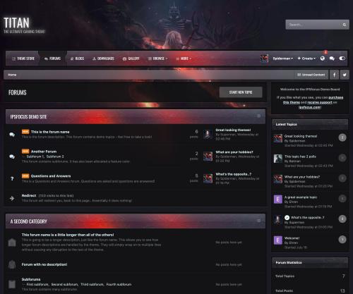 Titan for IPS.Suite Titan is the ultimate gaming theme, based upon a large wallpaper image which is blurred behind textured navigation and category bars. Easily upload your own image via the theme settings to completely change the colour scheme, or let your members choose from a predefined selection! Theme features Theme Settings Easily enable, disable or modify theme features such as background images, logos, social media links, guest messages and colors. This makes modifications and upgrades very simple since little code changes are required. Unique navigation design Titan features a unique navigation design, utilising an animated effect on-hover. Blurred headers The navigation bar and category headers inherit a blurred version of your background image. Compatible with all modern browsers, except IE. Social links Social links can be enabled/disabled and customized to your own URL, allowing you to easily link to your social network pages (facebook, twitter, etc) Background picker Your members can choose their own background image (or color) from a predefined selection and their choice is saved via cookies. This feature can be configured and disabled if necessary within the theme settings. Global message Display a message across the top of your site with important announcements. Once your members have seen the message, they can press the Dismiss button to remove it (until you configure a new one). Guest message A customizable message can be shown to guests, prompting them to either register or login to your forum. Two designs, "billboard" and "alert" (shown) are available. HTML logo with slogan Easily add/edit your text logo and slogan from within the theme settings. If required, the text can be replaced by an image instead. Mega Footer A mega footer with configurable column numbers and content can be enabled and customized all within the theme settings. Demo // Detailed list of features -