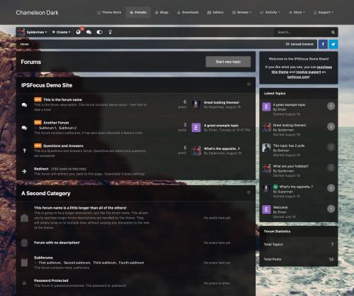 Chameleon Dark by ipsfocus Chameleon Dark is an adaptive skin which uses semi-transparent "frosted glass" content boxes, allowing your background image to partially show through. This allows you to easily customize the genre of the theme by changing only the background image. The header collapses on-scroll, and stays at the top of the screen for easy access. Themes features Theme Settings Easily enable, disable or modify theme features such as background images, logos, social media links, guest messages and colors. This makes modifications and upgrades very simple since little code changes are required. Sticky, shrinking header The header shrinks in size and sticks to the top of the page for easy access to user controls and the board index. Frosted Glass content boxes Your background image is displayed beneath your content boxes which have a frosted glass effect (available in all modern browsers except IE and Edge). Background picker If enabled, your members can choose their own background image from a predefined selection and their choice is saved via cookies. Guest message A customizable message can be shown to guests, prompting them to either register or login to your forum. Two designs, "billboard" and "alert" (shown) are available. Social links Over 20 social links can be enabled/disabled and customized to your own URL, allowing you to easily link to your social network pages (facebook, twitter, etc). If your site doesn't exist, it's easy to add custom icons to the list! HTML logo with slogan Easily add/edit your text logo and slogan from within the theme settings. If required, the text can be replaced by an image instead. Mega Footer A mega footer with configurable column numbers and content can be enabled and customized all within the theme settings. High quality on every screen! By using scalable fonts and css effects to create the theme, it'll look great on any screen - even ones with high resolutions! Want to see more? Check out the screenshots and live demo on IPSFocus! -